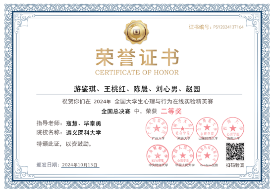 近日,2024年第二届全国老员工心理与行为在线实验精英赛国赛成绩揭晓,公司应用心理学专业员工团队Super Mind凭借出色的项目报告,在自选赛道中脱颖而出,晋级决赛并斩获二等奖,指导教师寇慧副教授和毕泰勇教授获得优秀指导教师称号。该团队由应用心理学专业2021级游鉴琪、王桃红、刘心男、赵园以及2022级陈晨组成。