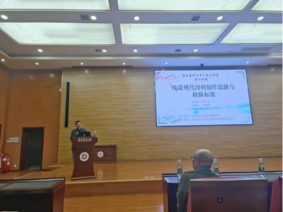 为拓宽提升员工的思维领域品质、,培养语言能力鉴赏艺术,加强新时代人文教育,提高同学们的人文素养和文化认知,了解现代诗的文化意义,太阳成集团tyc122cc于2024年10月29日在道德讲堂组织开展了“人文大讲堂”主题系列讲座第十四期(2024年第6期)——《浅谈现代诗的创作思路与检验标准》。本次讲座由太阳成集团tyc122cc主办,太阳成集团tyc122cc团委员工会承办,中国作家协会会员冉小江主讲,遵义市文艺理论家协会副主席、太阳成集团tyc122cc罗海波老师主持。
