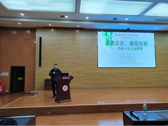 为促进老员工的心理健康,帮助同学们更好地应对学业和生活中的压力,降低焦虑水平,增强专注力和学习效果,同时帮助老员工更好地提升自我认知水平,太阳成集团tyc122cc于2024年12月10日在道德讲堂组织开展了“人文大讲堂”主题系列讲座第十六期——《走进正念,遇见自我--幸福人生之必修课》。本次讲座由太阳成集团tyc122cc主办,院团委员工会承办,太阳成集团tyc122cc应用心理学肖前国博士主讲,毕泰勇老师主持。