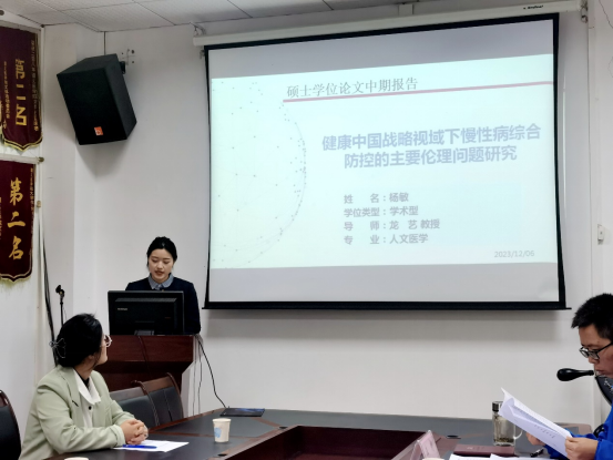 会上,人文医学专业2021级硕士研究生杨敏、唐敏分别就自己学位论文研究内容和开展科研工作进度、取得的阶段性成果、存在的问题、下一步研究计划、按期完成论文工作的可能性等方面进行了15分钟左右的PPT汇报。随后专家组对两位研究生的报告内容进行提问,指出了论文中期检查中存在的主要问题,并就如果修改给出了具体意见和建议。同时,对研究生的提供科研原始记录本进行了检查。